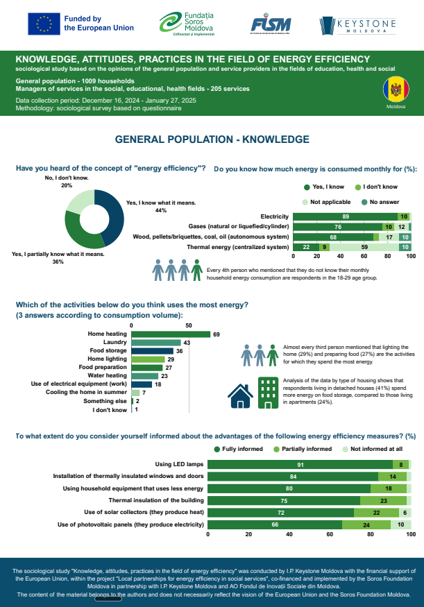 National Information and Awareness Campaign on the Implementation of Energy Efficiency Measures within the project âLocal Partnerships for Energy Efficiency in Social Services,â financially supported by the European Union, co-financed and implemented by the Soros Foundation Moldova, in partnership with IP Keystone Moldova and the AO Fondul de InovaČii Sociale din Moldova.