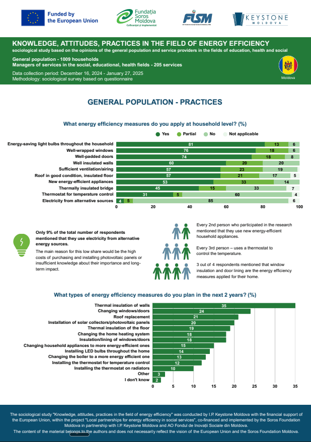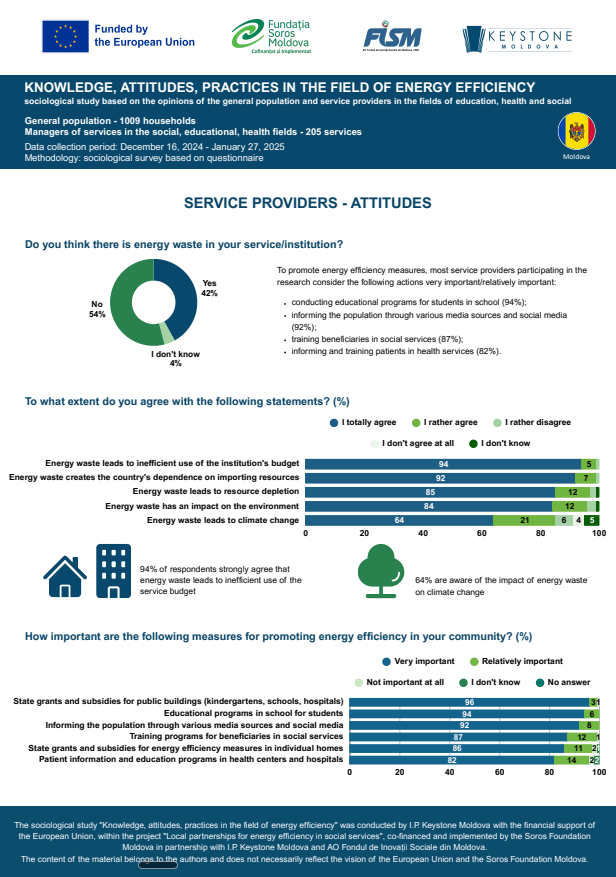 Service providers in education, social, and health sectors have a relatively high level of information and awareness regarding energy efficiency: 68% of service managers know what energy efficiency means, but 30% of respondents only partially understand the concept, suggesting gaps in understanding technical details, applicability, and the impact of energy efficiency measures in various contexts.